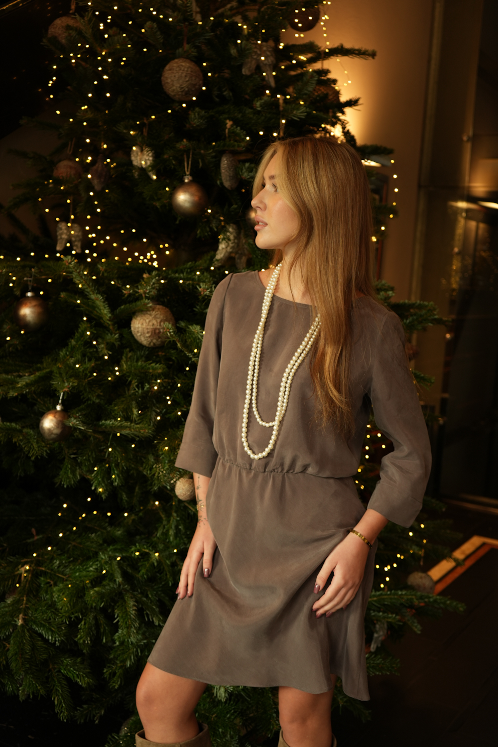Sukienka Noemi w pięknym czekoladowym odcieniu. Sukienka mini z delikatną gumką w pasie. Możesz regulować jej długość.