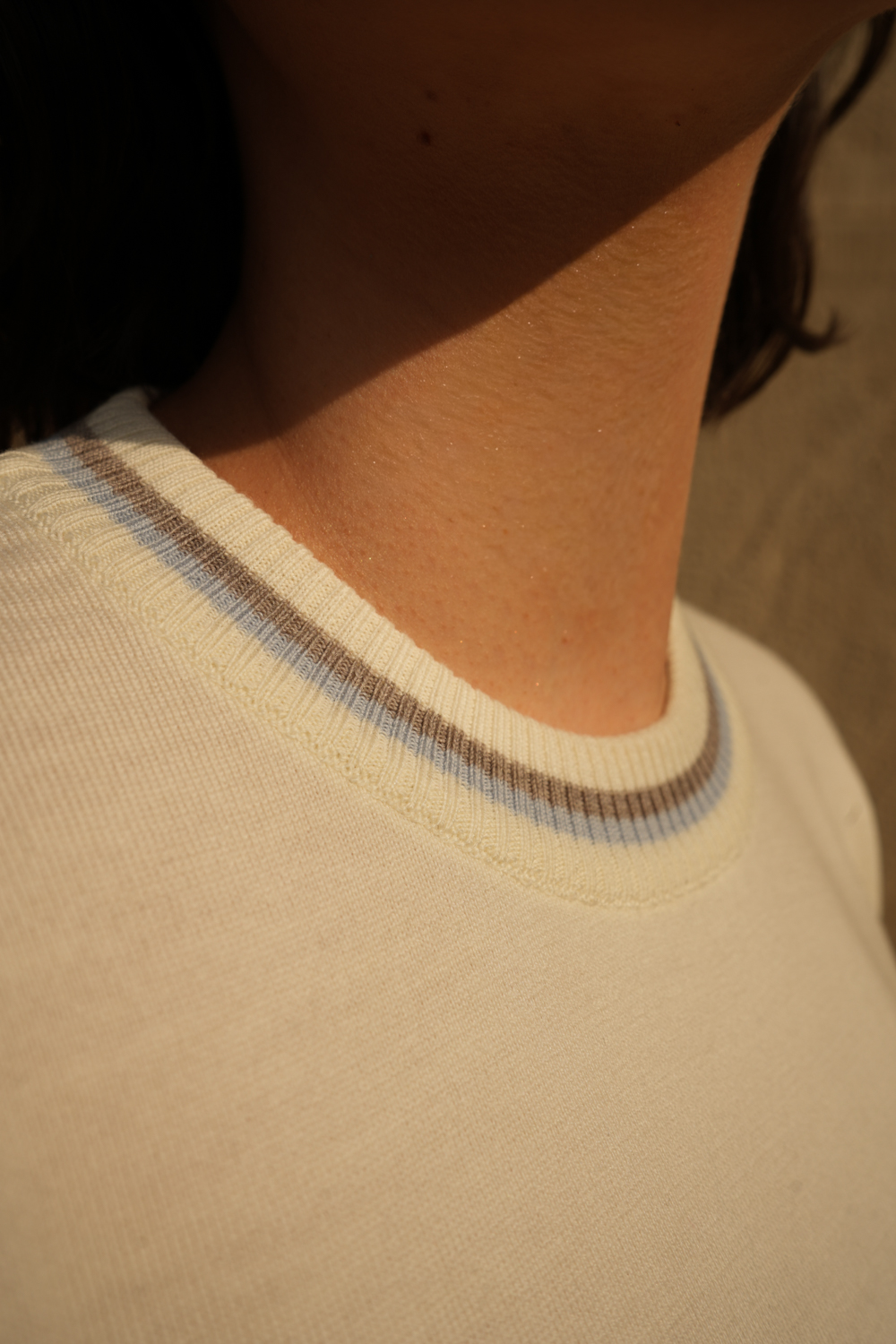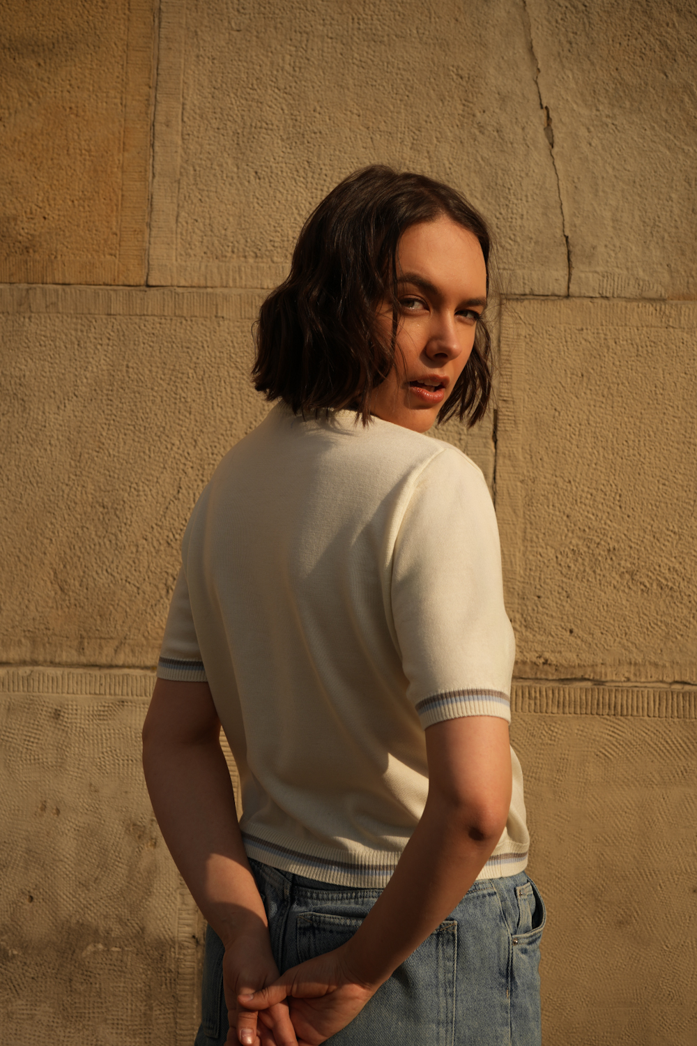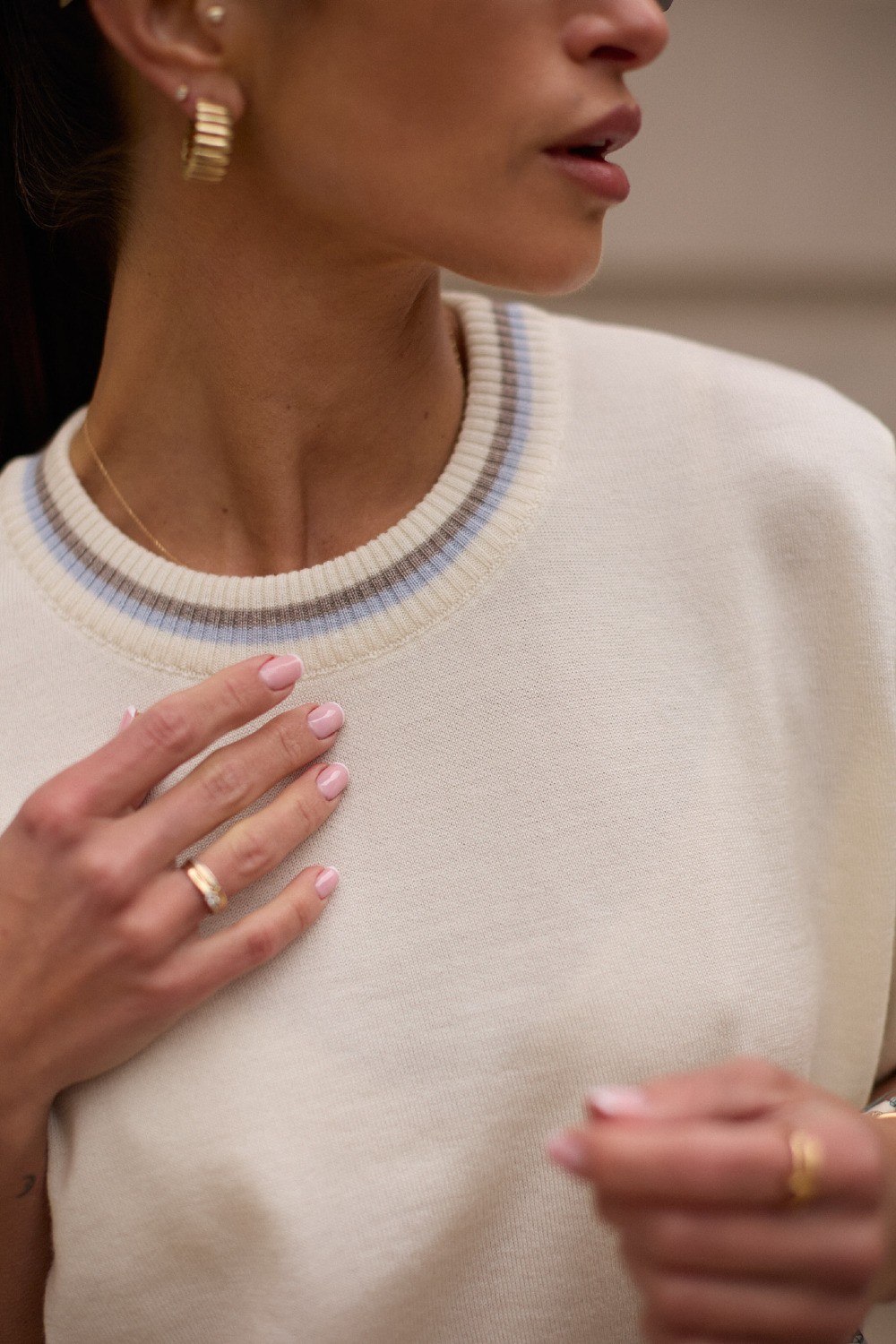 Sweter Alice to uniwersalny fason, który świetnie się wpisuje zarówno w codzienne stylizacje, jak i bardziej formalne stylizacje. Świetnie wygląda z długimi spodniami Margot, spódnicą mini lub ulubionymi jeansami. Kolor ecru, wykończony lamówką w kolorze brązowym i niebieskim.