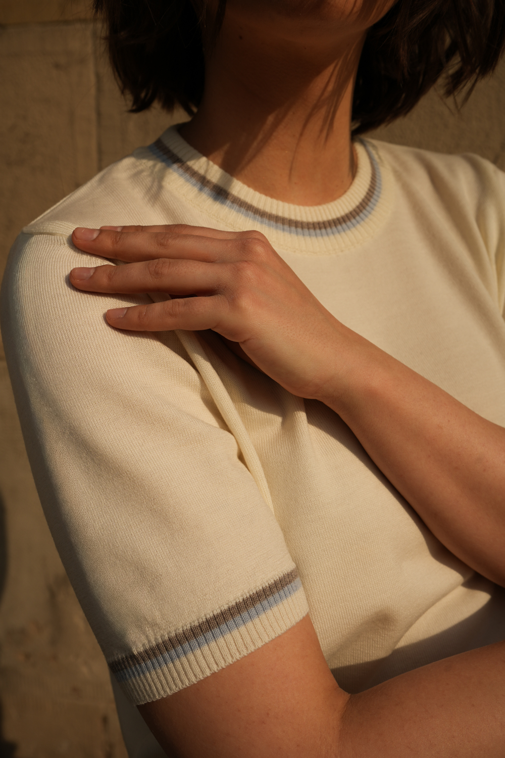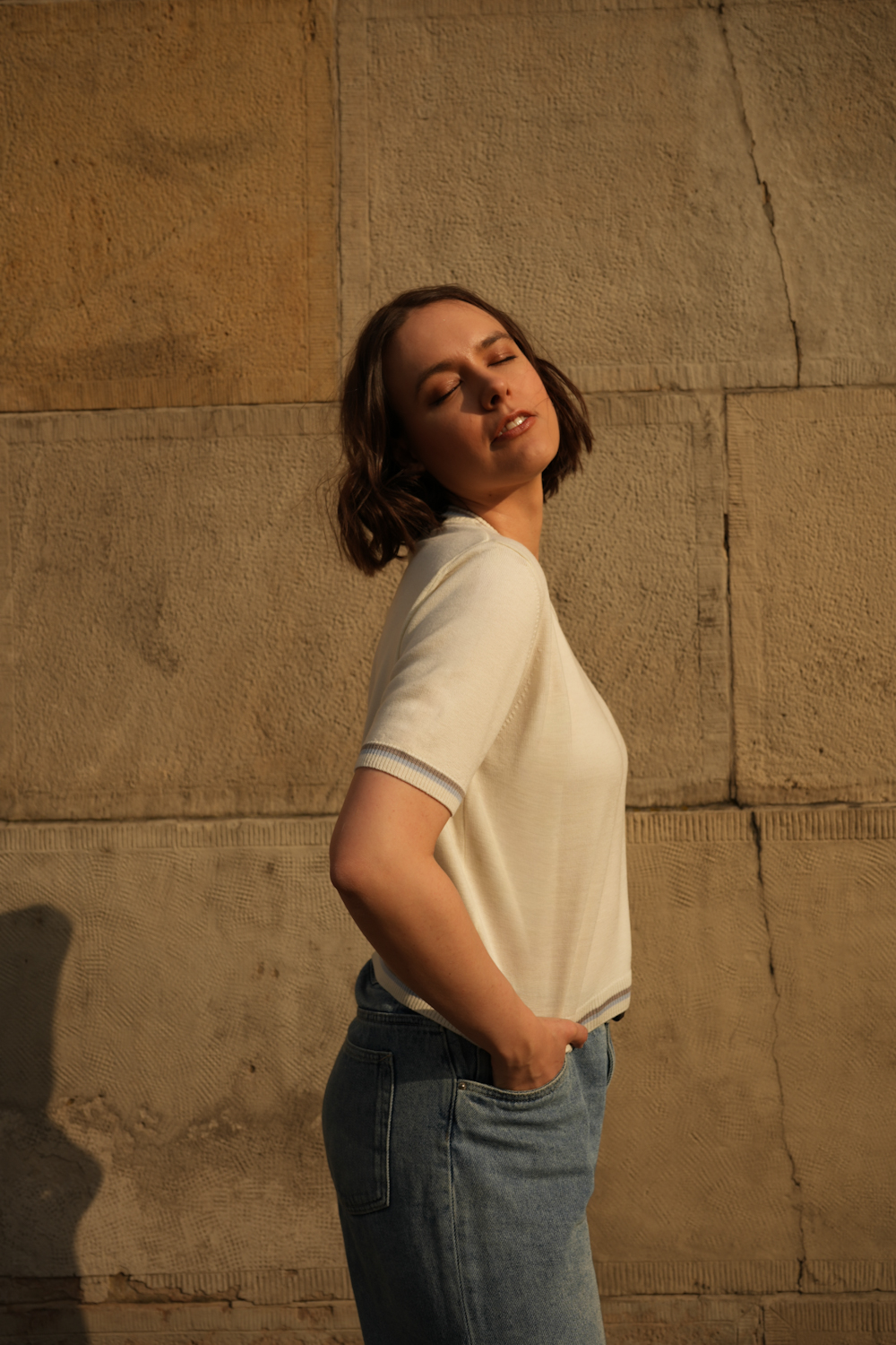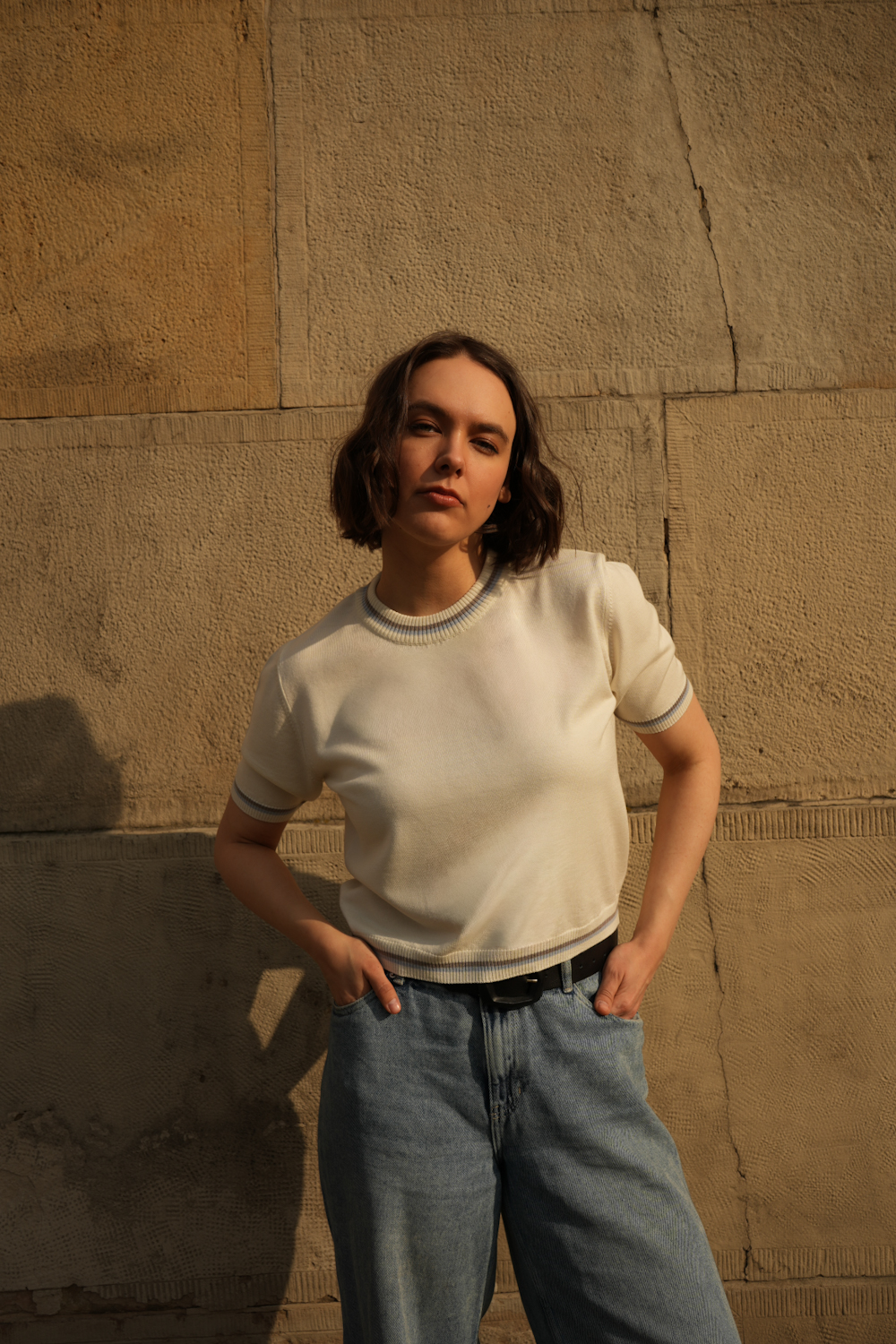 Sweter Alice to uniwersalny fason, który świetnie się wpisuje zarówno w codzienne stylizacje, jak i bardziej formalne stylizacje. Świetnie wygląda z długimi spodniami Margot, spódnicą mini lub ulubionymi jeansami. Kolor ecru, wykończony lamówką w kolorze brązowym i niebieskim.